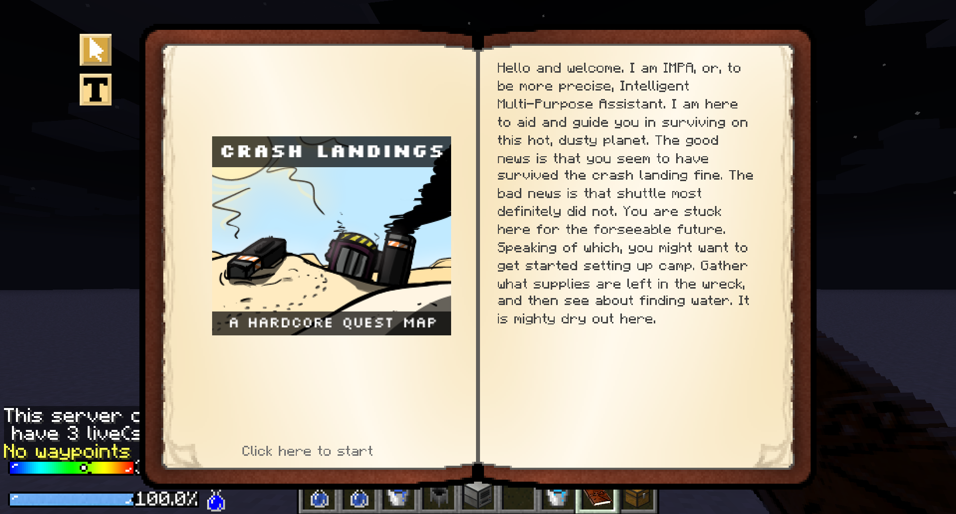 Crash landing is a feed the beast and curseforge modpack by iskandar. No water, no food, no real supplies. Anyone know of a way to automatically fill up a camel pack without having to craft it using 1 x camel pack and 4 x fresh water? I really have no idea how to start in this unforgiving game. New hqm modpack like crash landing.