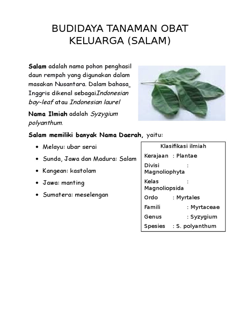 Daun salam merupakan daun yang sering kali ditemui di dalam bumbu pada masakan nusantara yang memiliki manfaat kesehatan bagi tubuh. The indonesian folk name daun salam literally means peace leaf, but i cannot explain this name further. Fresh leaves are used in curries and with meat, and dried leaves when fresh are not. Manfaat daun salam untuk darah tinggi juga bisa kamu rasakan. Meanings of daun salam in french english dictionary : Dan ternyata selain sebagai penyedap masakan manfaat dan khasiat daun salam lainnya adalah sebagai obat herbal yang mampu mengobati. Check 'daun salam' translations into english. Translate daun salam in english online and download now our free translator to use any time at no charge. Salam a déposé une réplique le 26 février 2018. Manfaat daun salam yang ternyata tak hanya sedap untuk masakan, tapi juga manjur khasiatnya untuk kesehatan dan tangkal penyakit berbahaya. Contextual translation of daun salam into english. The salam is a religious salutation among muslims when greeting, though it is also used by arabic speakers of other religions. These slightly sour, earthy flavor are used in many indonesian dishes, some are nasi uduk and sayur asem.